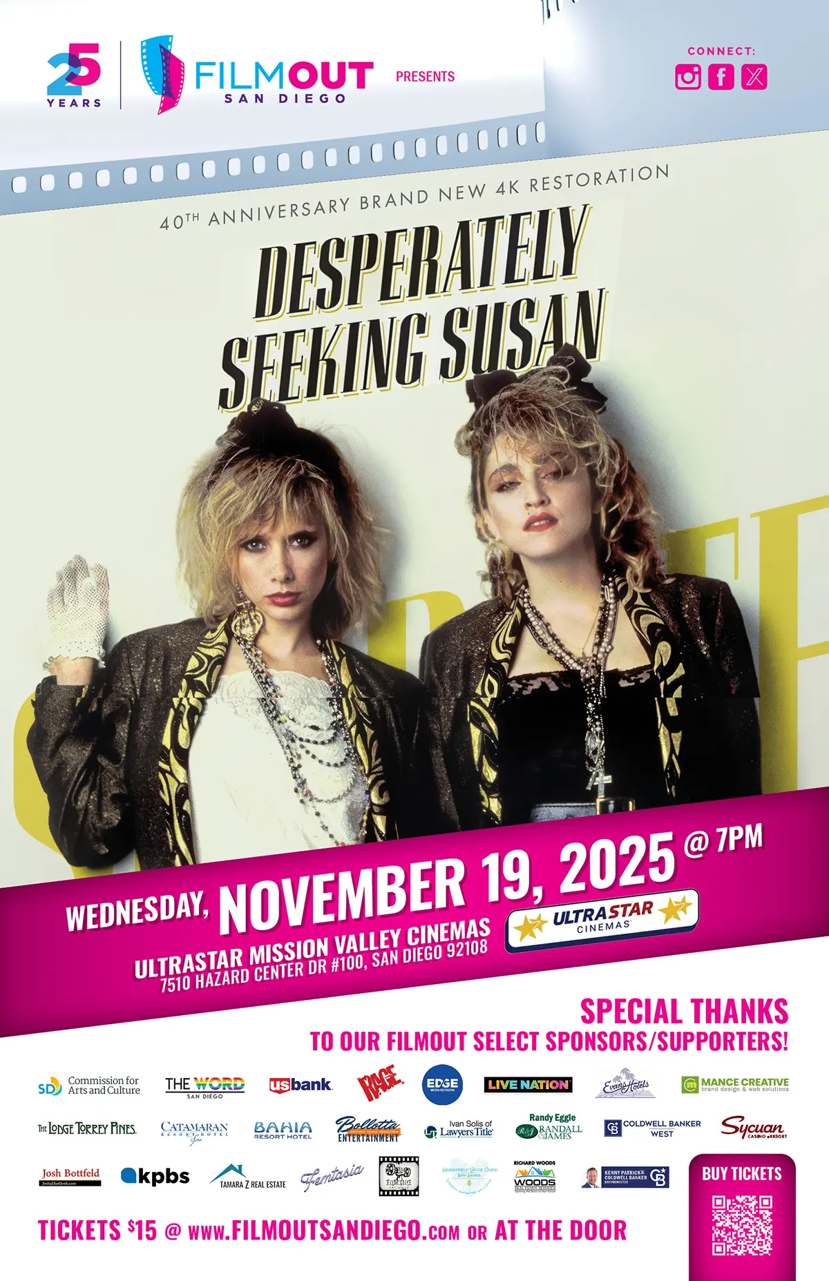 FilmOut gets “Into The Groove” with this stylish 1985 romantic comedy-drama directed by Susan Seidelman. Rosanna Arquette plays Roberta Glass, a suburban New Jersey housewife whose fascination with a personal ad in a newspaper propels her into an unexpected urban adventure. She becomes enamored with Susan Thomas (Madonna), a free-spirited bohemian living in New York. Roberta’s curiosity leads her to follow Susan into the city—wearing Susan’s distinctive tuxedo jacket—which results in a bump to the head, an ensuing bout of amnesia, and being mistaken for Susan herself. As Roberta embraces the mistaken identity, she tumbles into intrigue involving missing earrings, run-ins with a shady figure, and encounters with Susan’s circle of eclectic downtown characters. Set against the backdrop of 1980s New York’s gritty, vibrant East Village, the film pulses with neon-lit thrift stores, underground clubs, and vintage mystique. The cityscape itself becomes a character—alive, edgy, and full of creative energy. Originally released in March 1985, the film not only marked Madonna’s first major screen role, but also launched a wave of dazzling fashion—especially the iconic tuxedo jacket—and captured the era’s indie-feminist spirit with both urgency and whimsy. Now, freshly restored in 4K for its 40th anniversary, the film celebrates the director’s vision with new clarity and every neon shimmer, layered texture, and vintage detail sharper than ever. This restoration has been officially approved by Susan Seidelman and is currently being booked for special screenings throughout 2025.