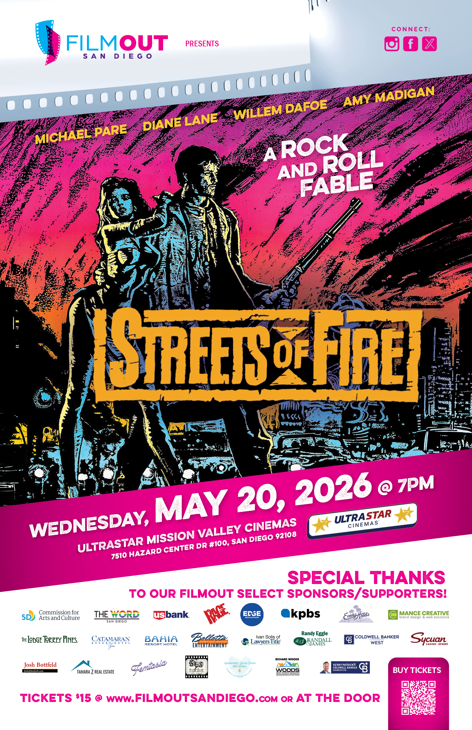 A neon-soaked rock-and-roll fable set in a stylized city, Streets of Fire follows ex-soldier Tom Cody (Michael Paré) as he returns to rescue his former girlfriend, rock singer Ellen Aim (Diane Lane), after she’s kidnapped by a leather-clad biker gang led by the ruthless Raven (Willem Dafoe). Joined by tough-talking manager Billy Fish (Rick Moranis) and soldier-turned-warrior McCoy (Amy Madigan), Tom battles love, loyalty, and chaos in a world fueled by music and rebellion. A cult classic known for its bold visuals, pounding soundtrack, and timeless cool.
