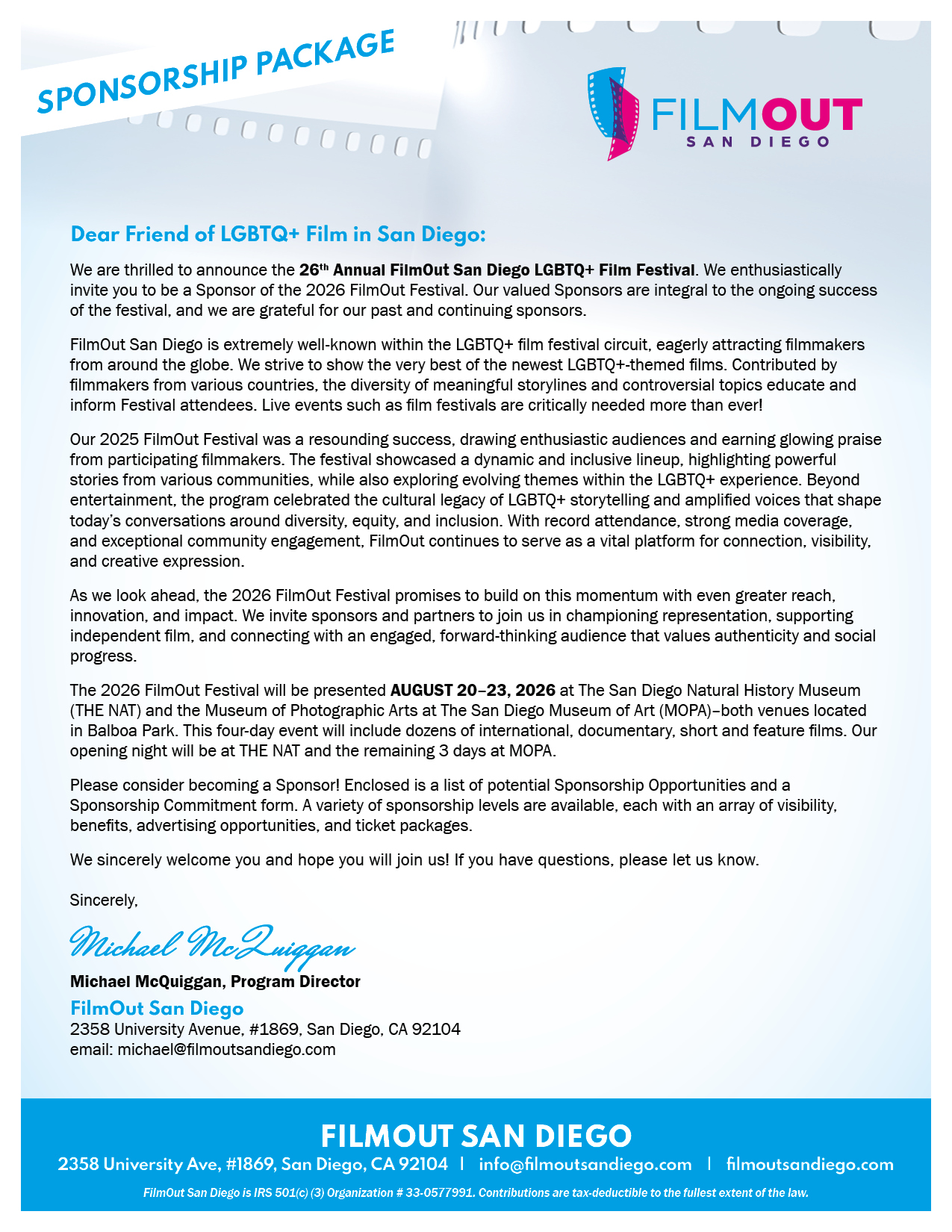 We now invite you to become a sponsor of FilmOut San Diego. We hope you will join us! Thank you for taking the time to consider sponsorship. Click below to download our Sponsorship Packet.